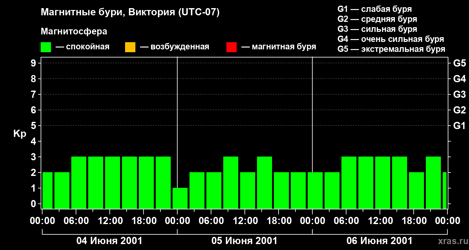 Изменения геомагнитного индекса Kp с 4 по 6 июня 2001 года для средних широт
