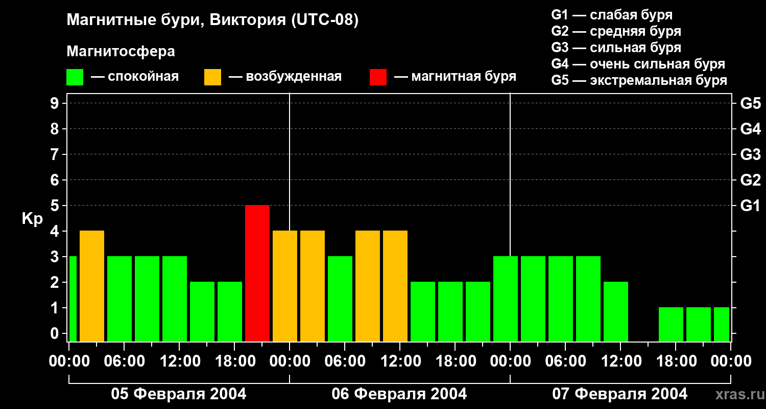 Изменения геомагнитного индекса Kp с 5 по 7 февраля 2004 года для средних широт