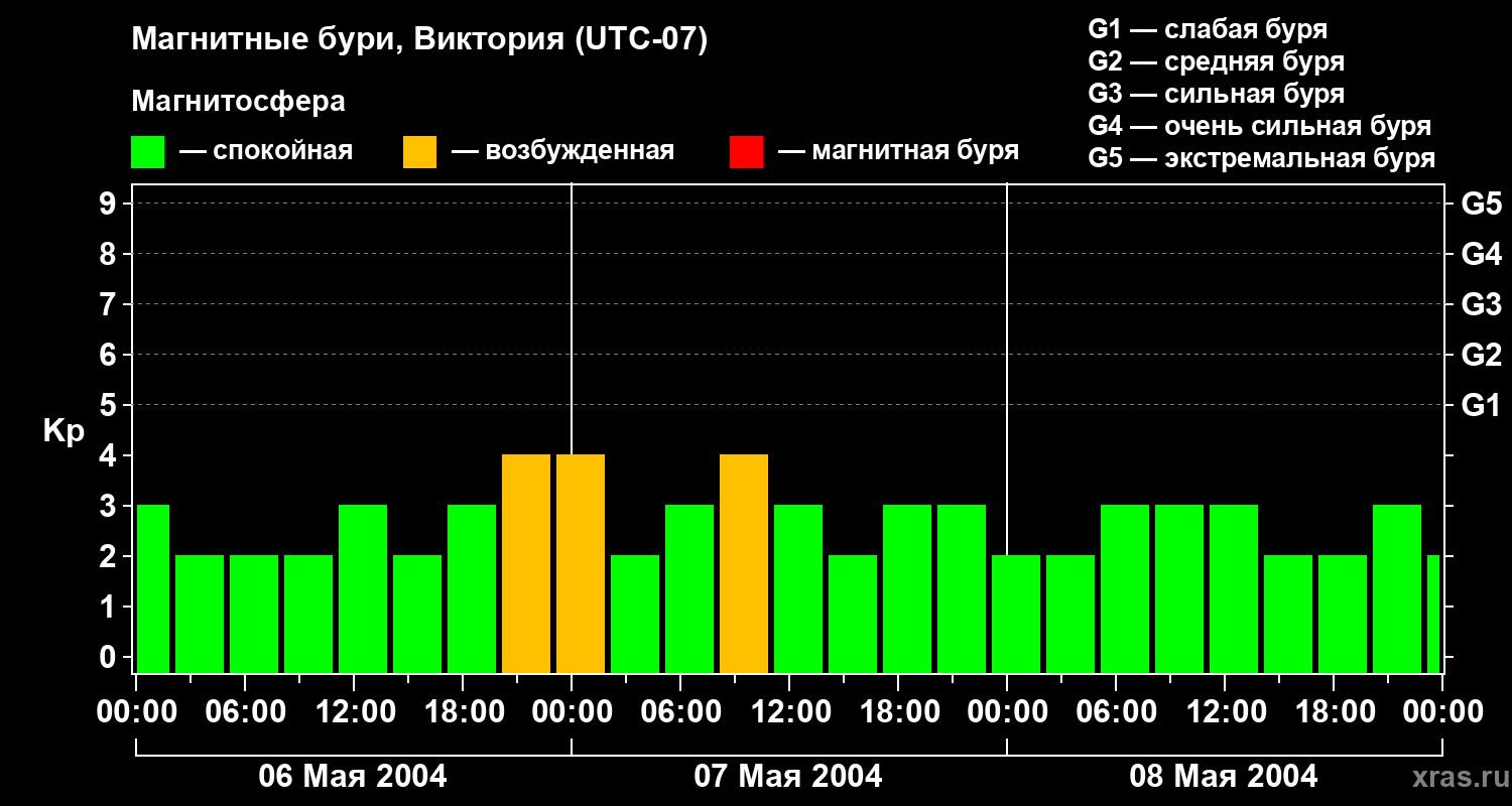 Изменения геомагнитного индекса Kp с 6 по 8 мая 2004 года для средних широт