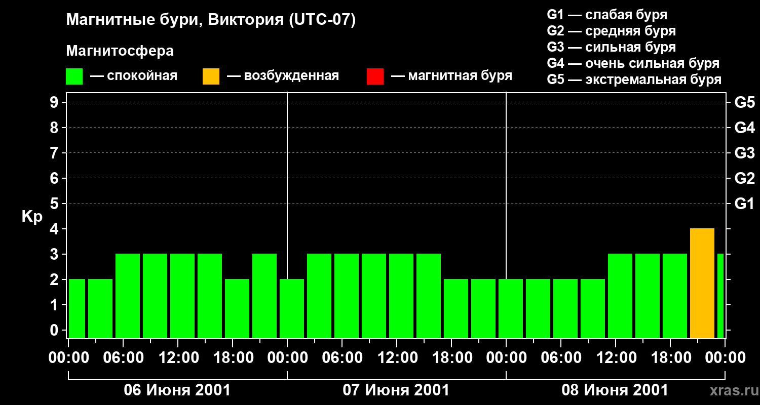 Изменения геомагнитного индекса Kp с 6 по 8 июня 2001 года для средних широт