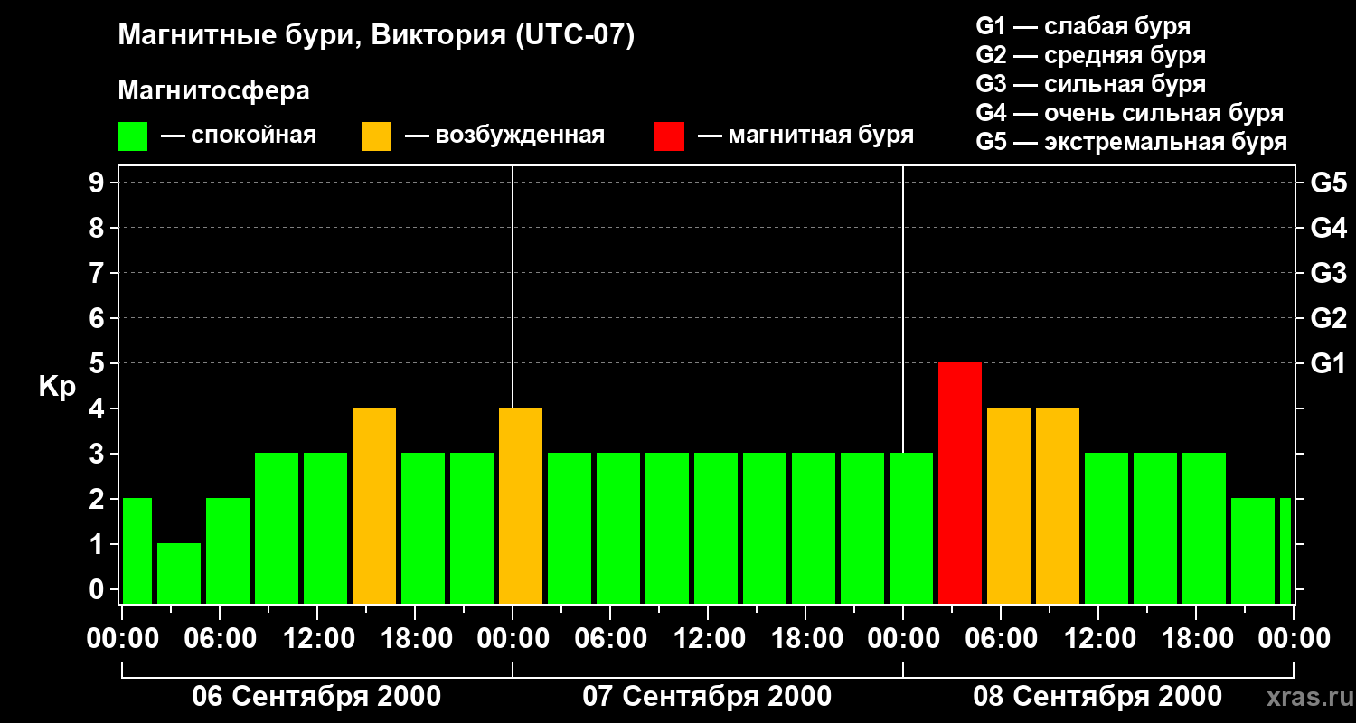 Изменения геомагнитного индекса Kp с 6 по 8 сентября 2000 года для средних широт
