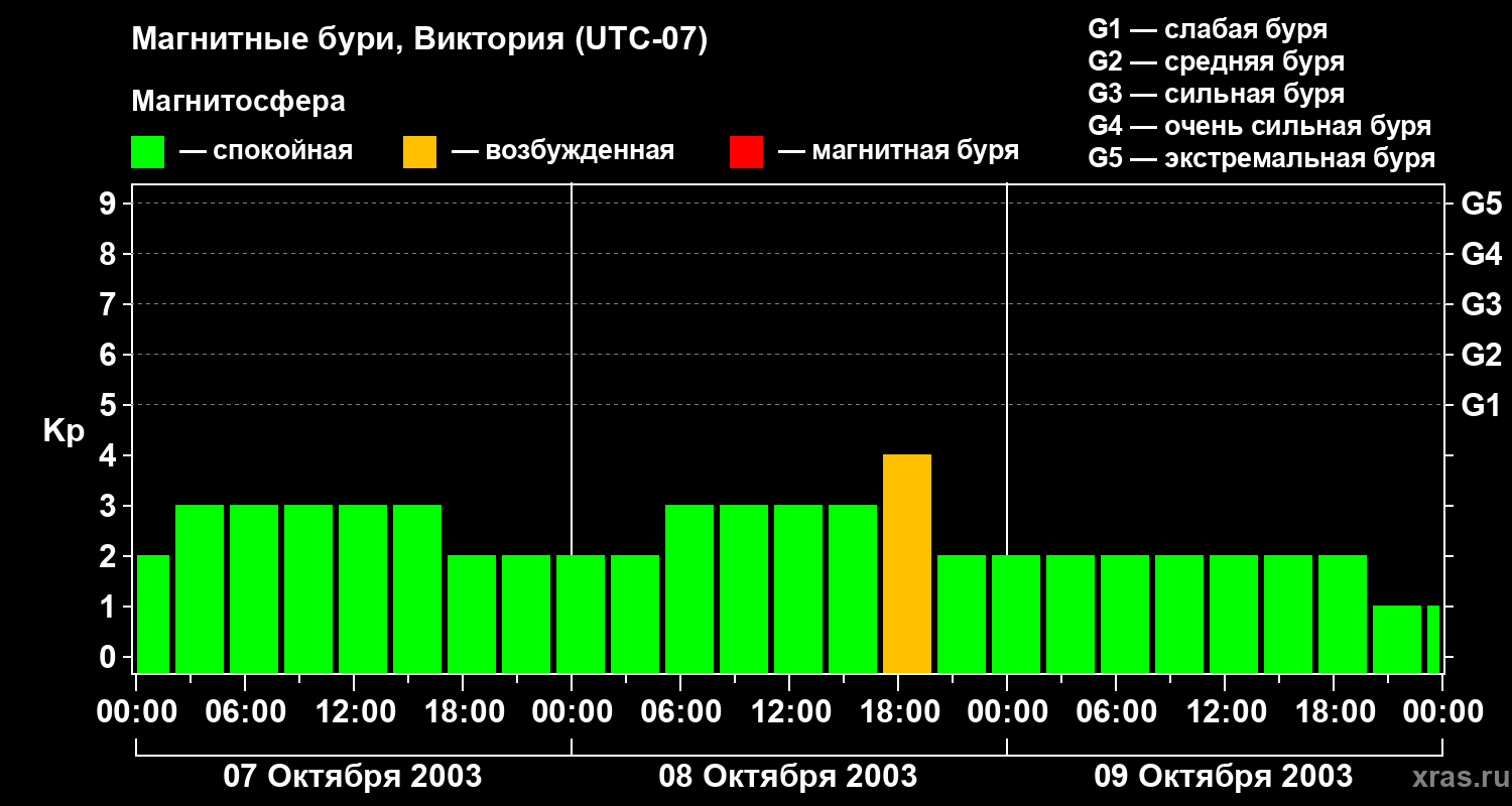 Изменения геомагнитного индекса Kp с 7 по 9 октября 2003 года для средних широт