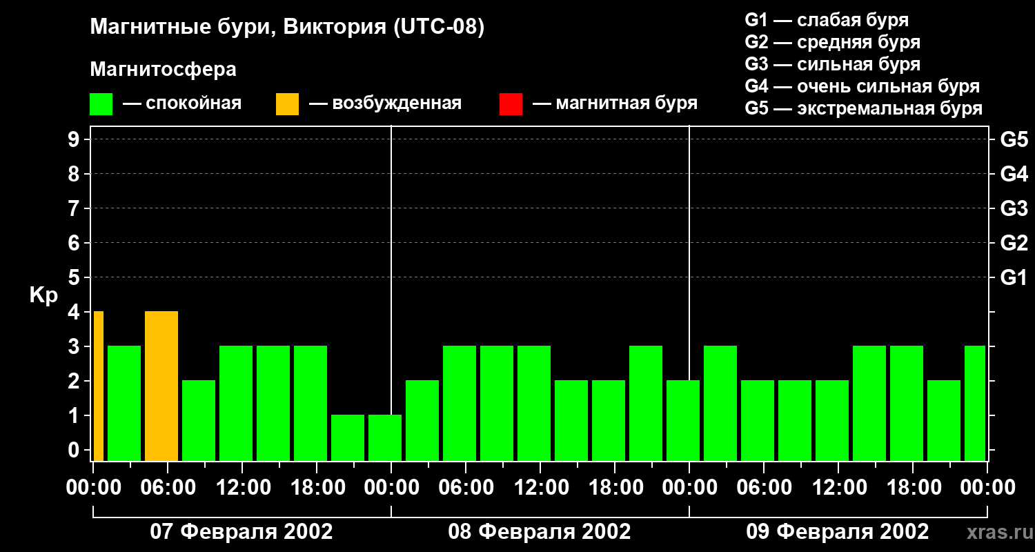 Изменения геомагнитного индекса Kp с 7 по 9 февраля 2002 года для средних широт