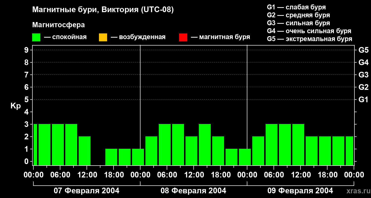 Изменения геомагнитного индекса Kp с 7 по 9 февраля 2004 года для средних широт