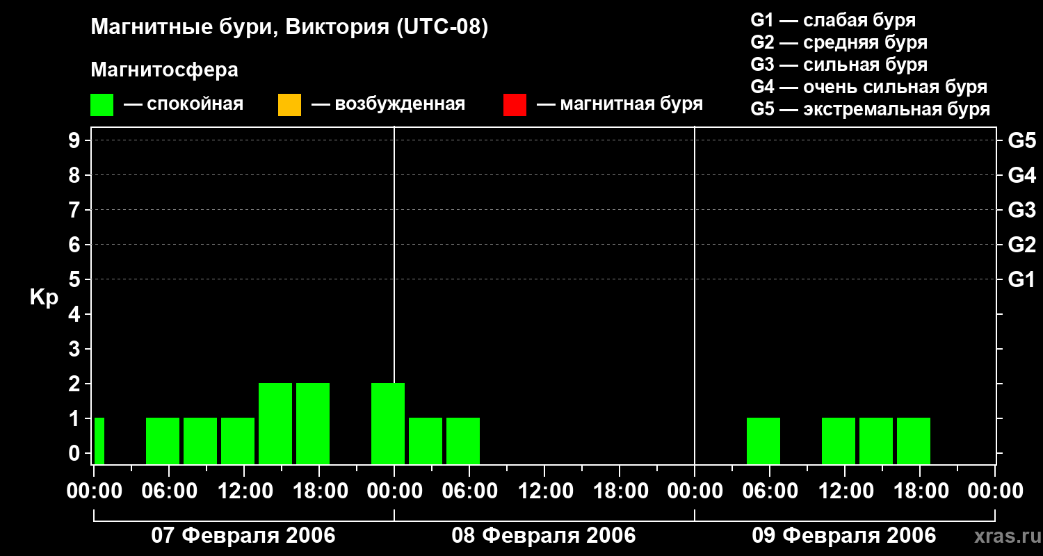 Изменения геомагнитного индекса Kp с 7 по 9 февраля 2006 года для средних широт