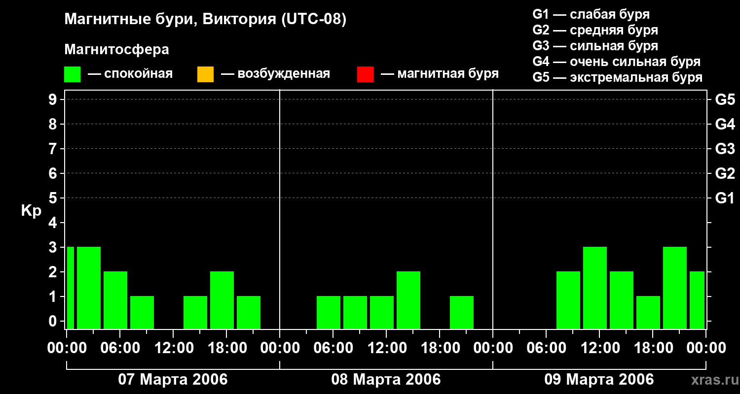 Изменения геомагнитного индекса Kp с 7 по 9 марта 2006 года для средних широт