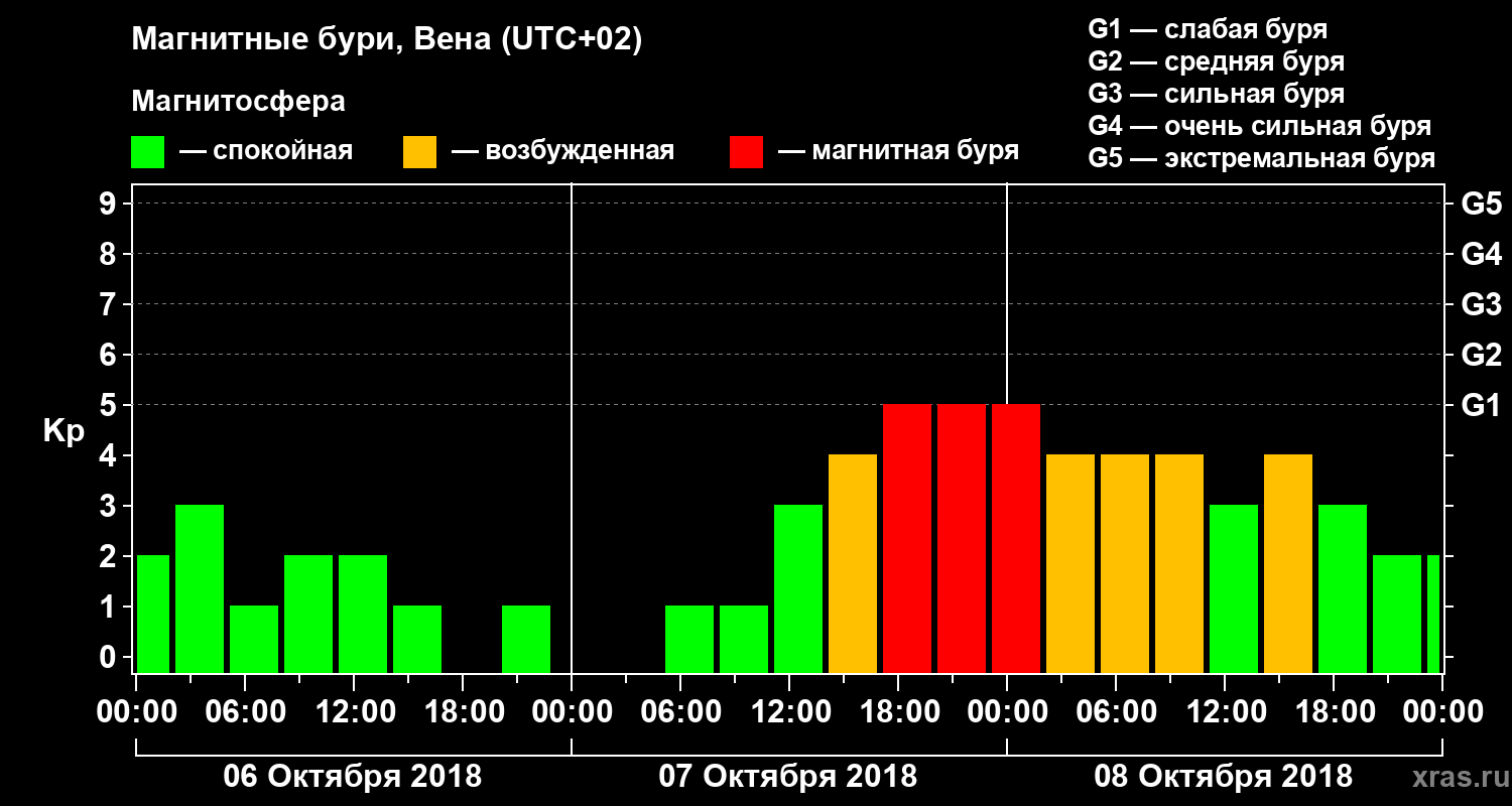 Изменения геомагнитного индекса Kp с 6 по 8 октября 2018 года для средних широт