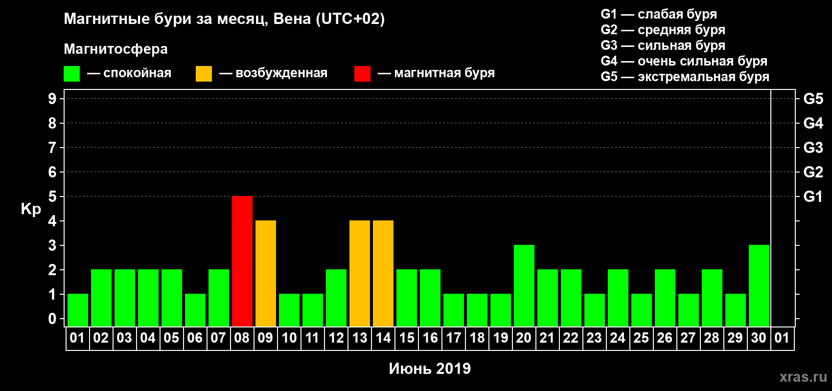Изменения максимального суточного геомагнитного индекса Kp в июне 2019 года для средних широт