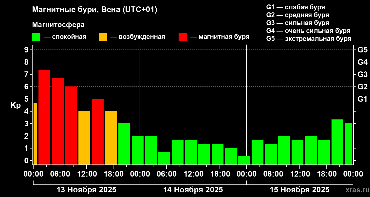 Изменения геомагнитного индекса Kp с 13 по 15 ноября 2025 года для средних широт