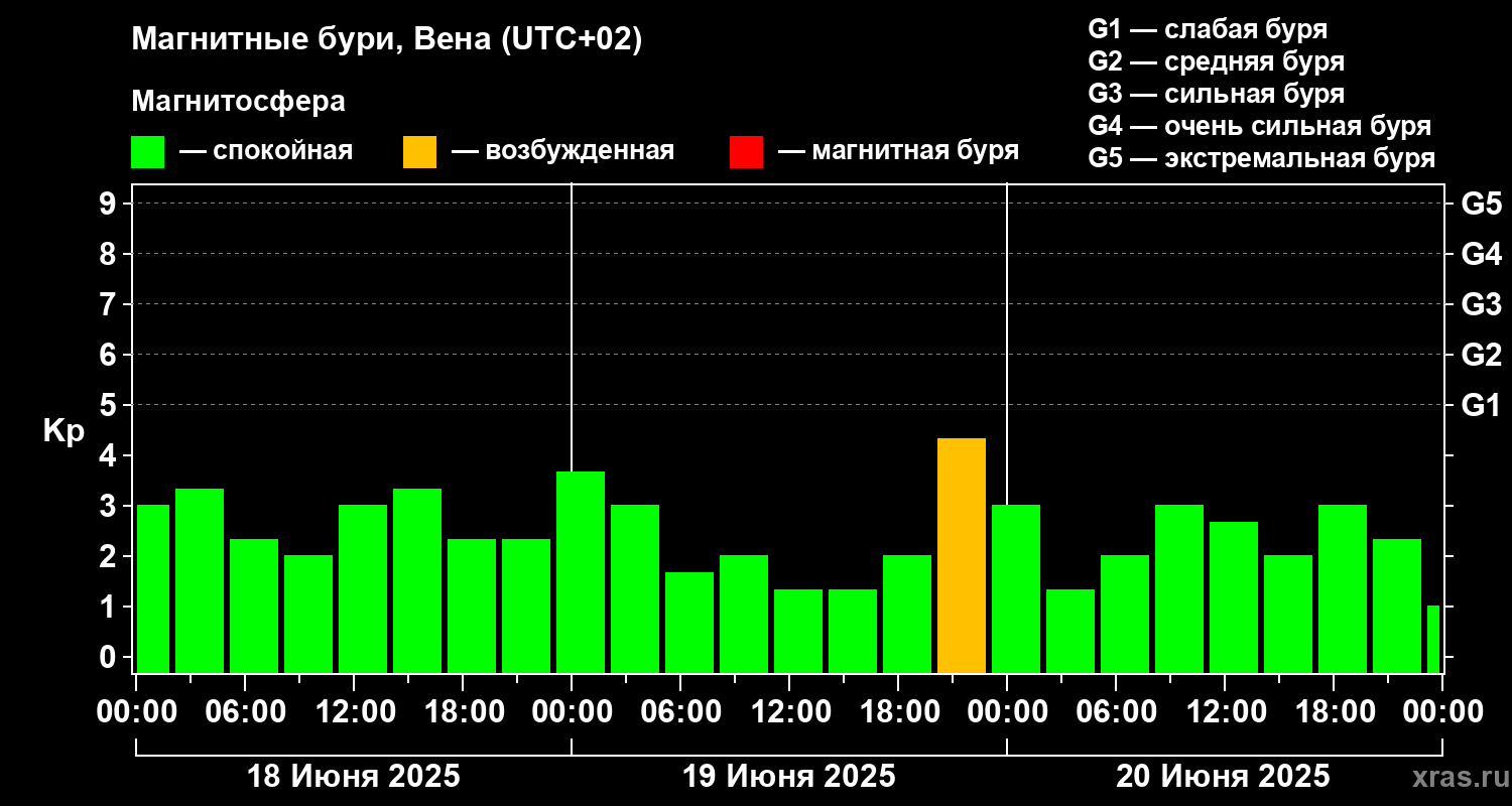 Изменения геомагнитного индекса Kp с 18 по 20 июня 2025 года для средних широт