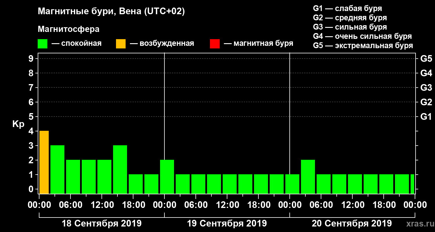 Изменения геомагнитного индекса Kp с 18 по 20 сентября 2019 года для средних широт