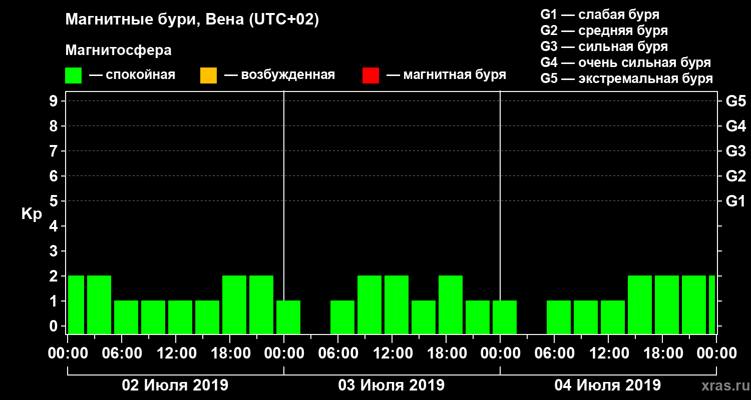 Изменения геомагнитного индекса Kp с 2 по 4 июля 2019 года для средних широт