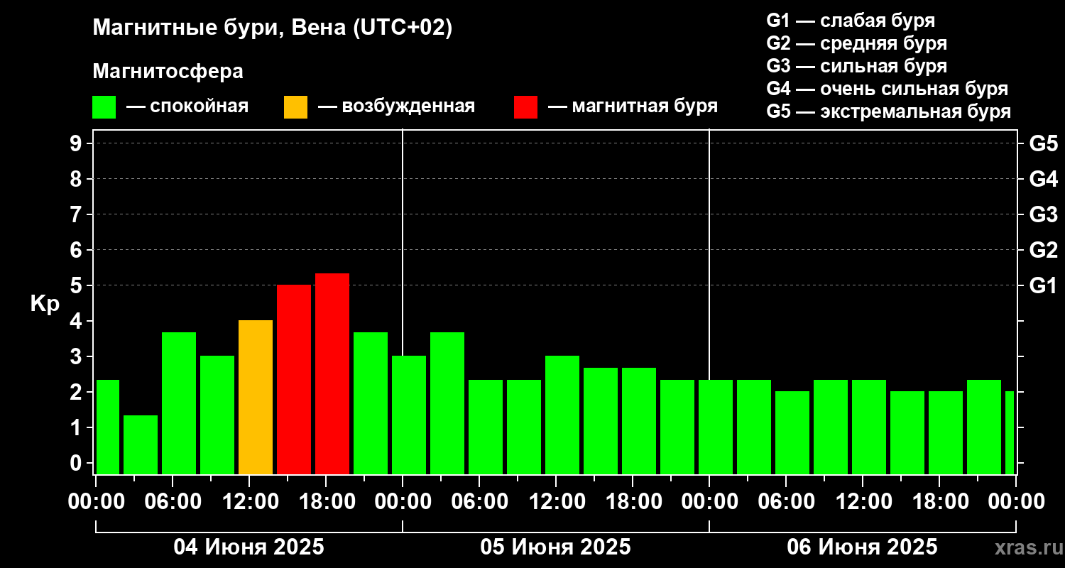 Изменения геомагнитного индекса Kp с 4 по 6 июня 2025 года для средних широт