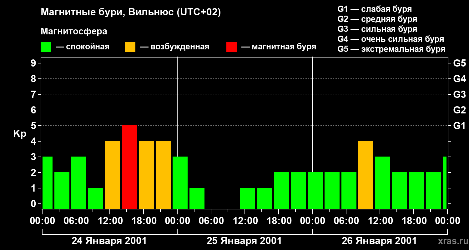 Изменения геомагнитного индекса Kp с 24 по 26 января 2001 года для средних широт