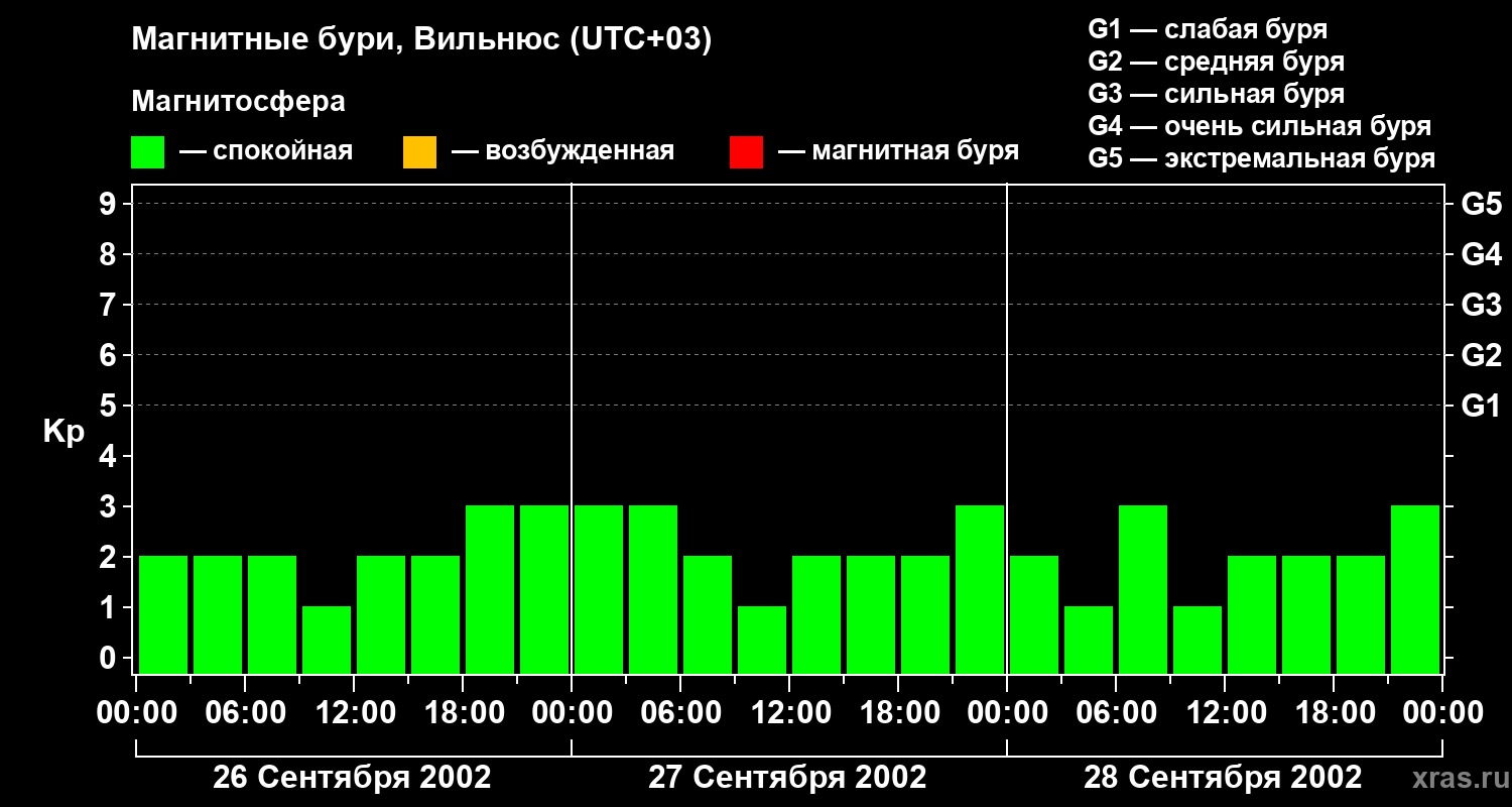 Изменения геомагнитного индекса Kp с 26 по 28 сентября 2002 года для средних широт