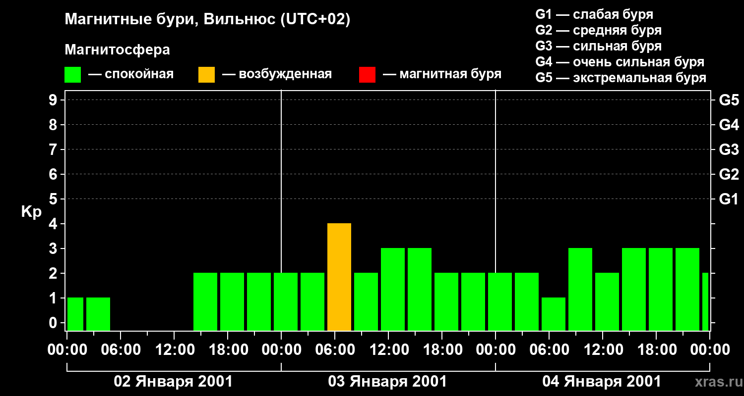 Изменения геомагнитного индекса Kp с 2 по 4 января 2001 года для средних широт