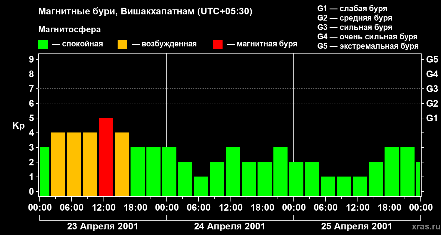 Изменения геомагнитного индекса Kp с 23 по 25 апреля 2001 года для средних широт