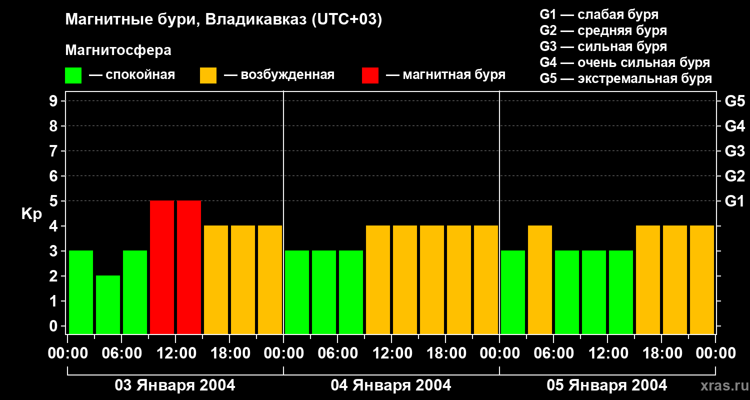 Изменения геомагнитного индекса Kp с 3 по 5 января 2004 года для средних широт