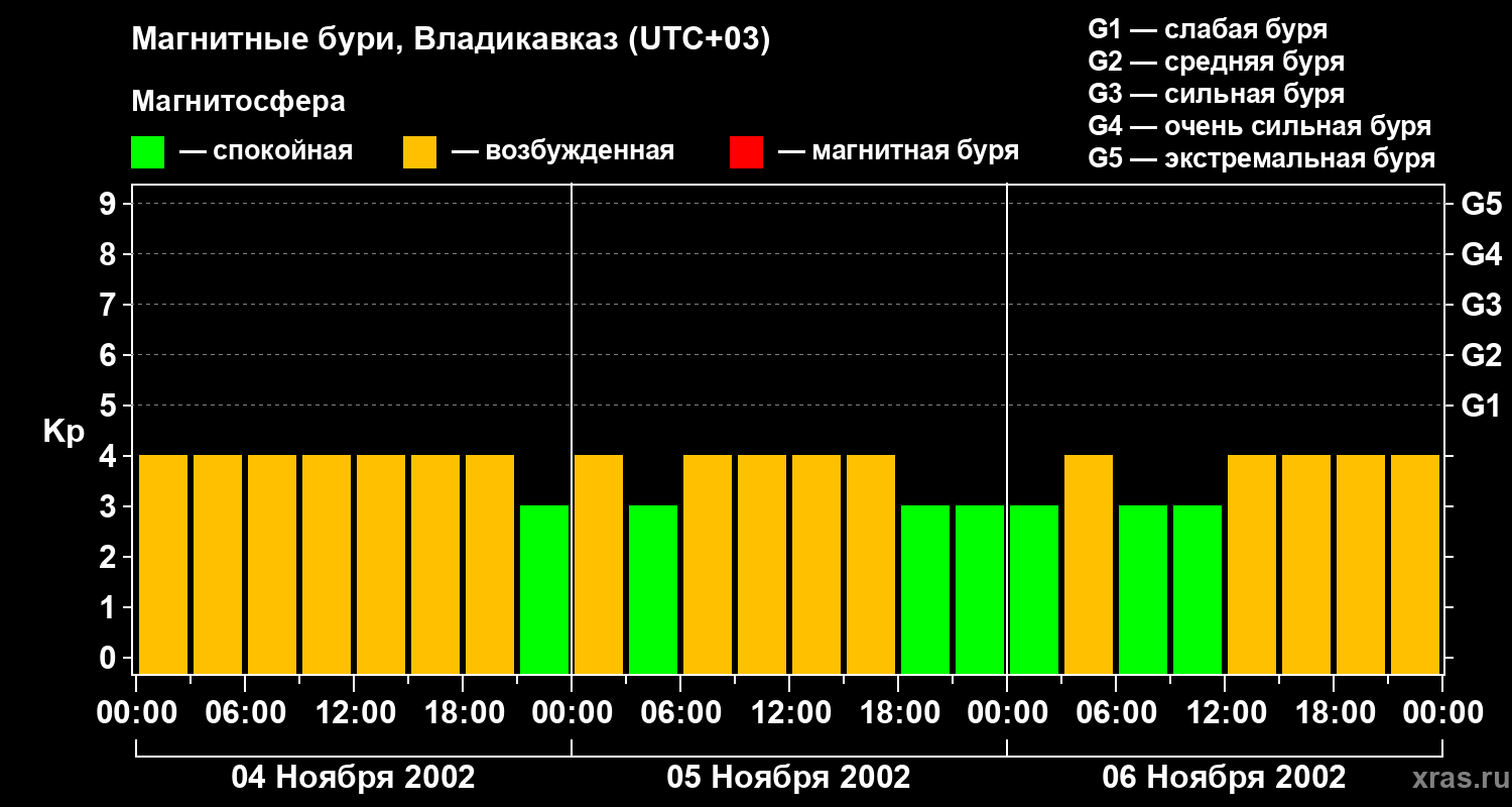 Изменения геомагнитного индекса Kp с 4 по 6 ноября 2002 года для средних широт