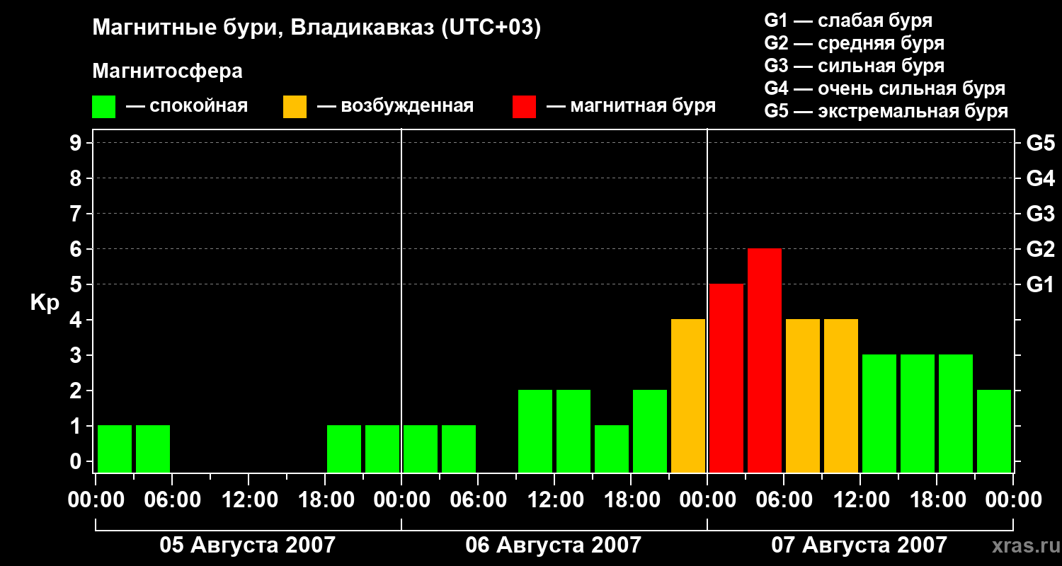 Изменения геомагнитного индекса Kp с 5 по 7 августа 2007 года для средних широт
