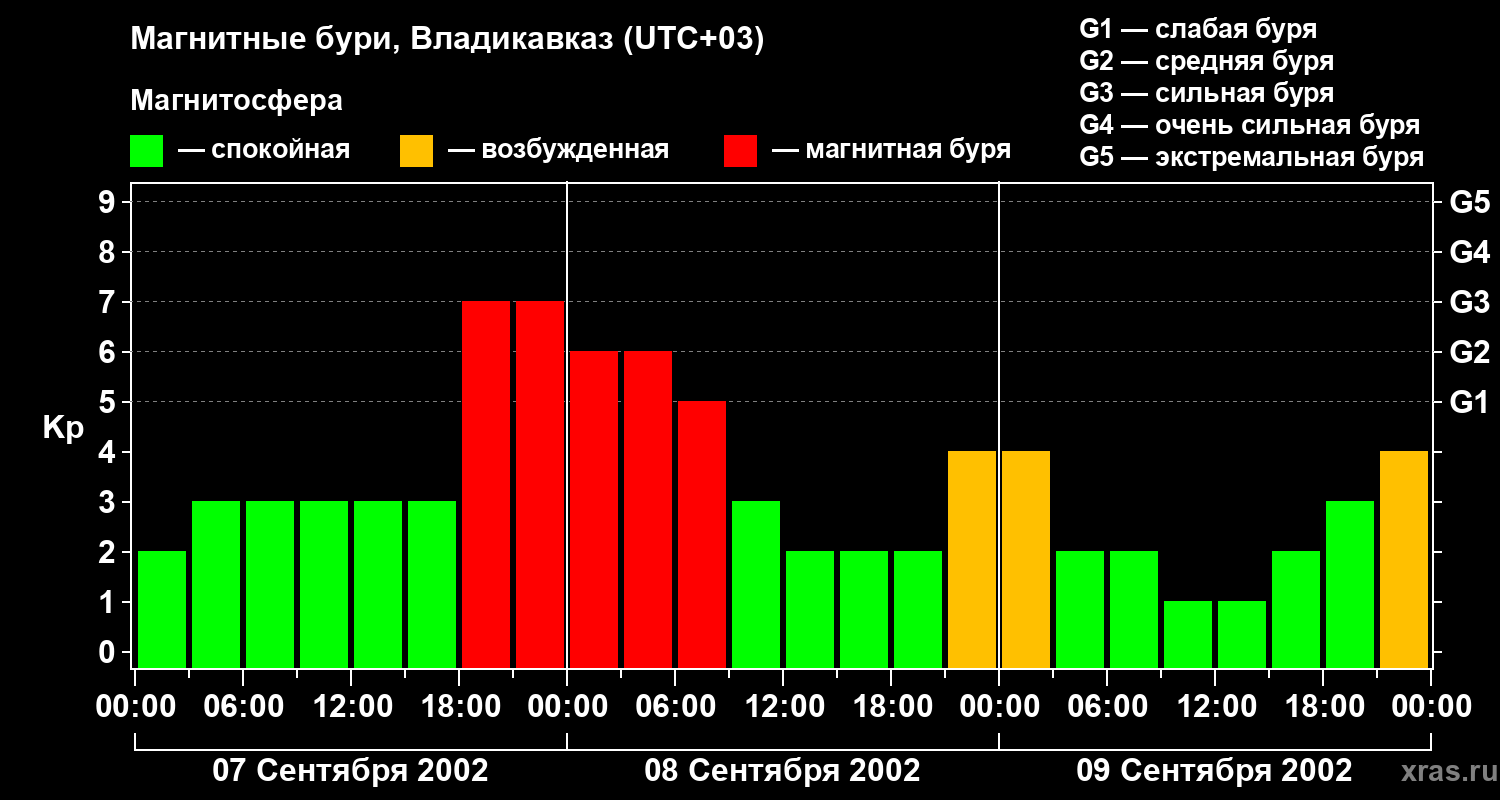 Изменения геомагнитного индекса Kp с 7 по 9 сентября 2002 года для средних широт