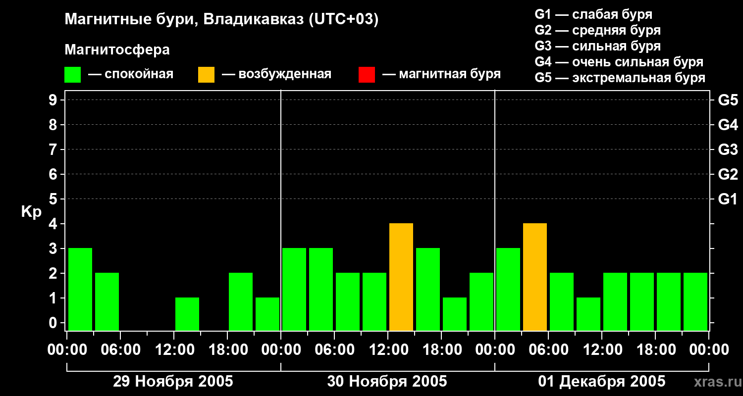 Изменения геомагнитного индекса Kp с 29 ноября по 1 декабря 2005 года для средних широт