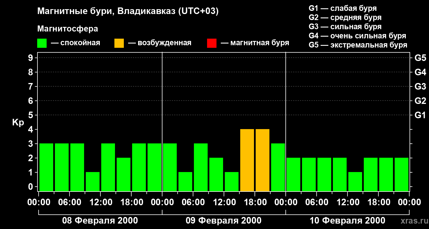Изменения геомагнитного индекса Kp с 8 по 10 февраля 2000 года для средних широт