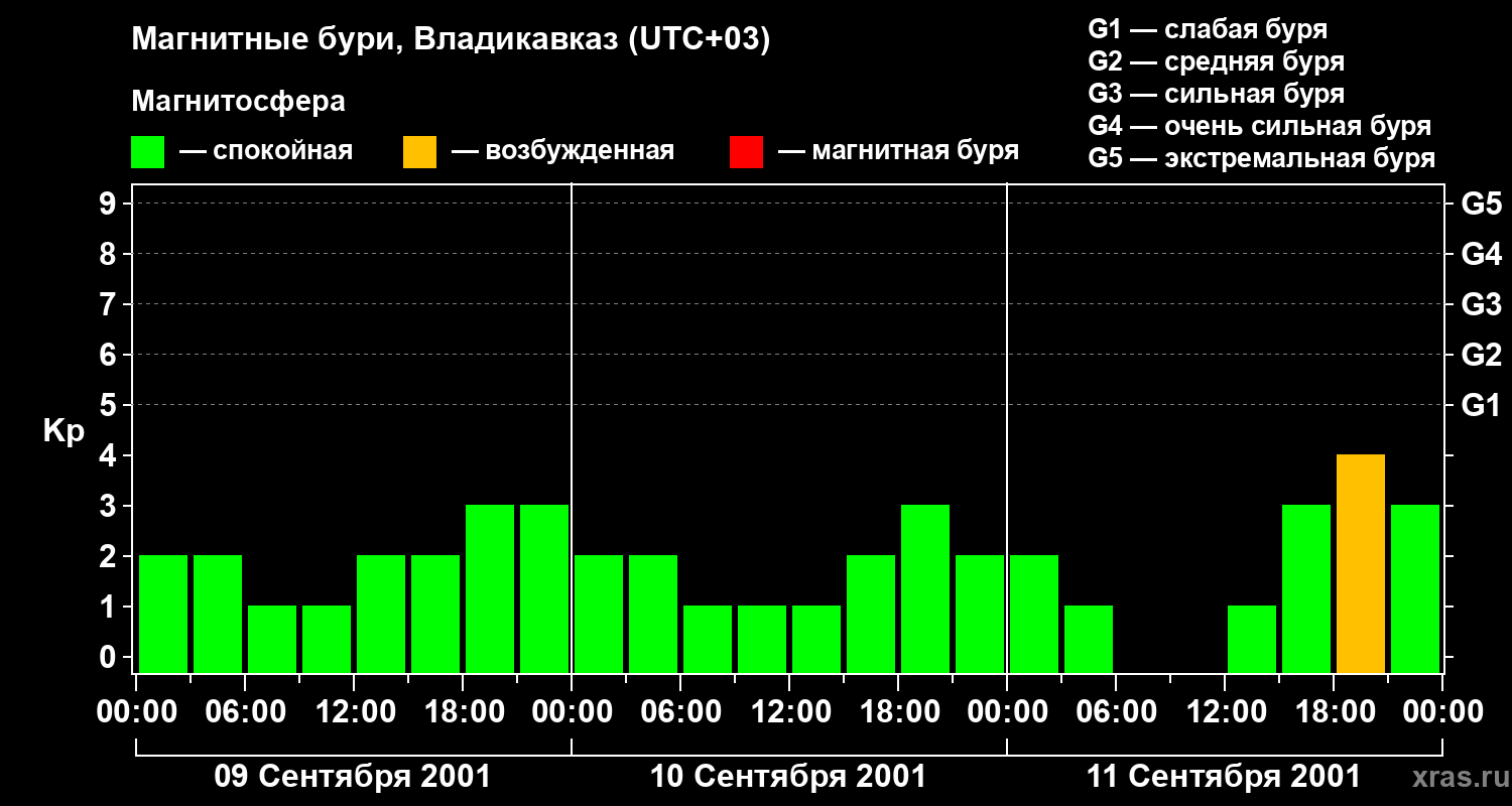 Изменения геомагнитного индекса Kp с 9 по 11 сентября 2001 года для средних широт