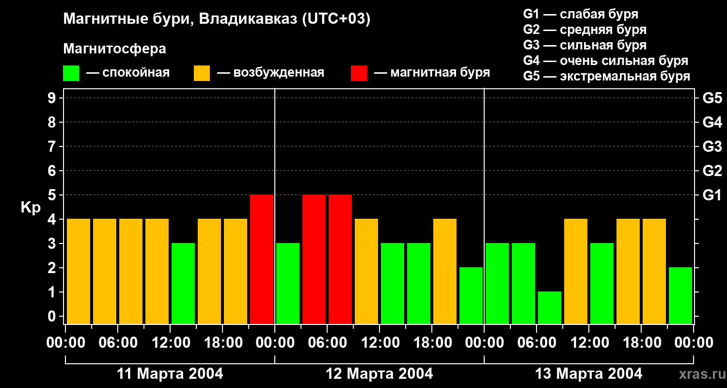 Изменения геомагнитного индекса Kp с 11 по 13 марта 2004 года для средних широт