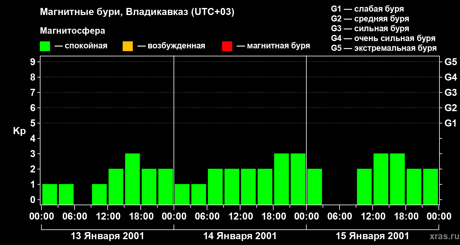 Изменения геомагнитного индекса Kp с 13 по 15 января 2001 года для средних широт