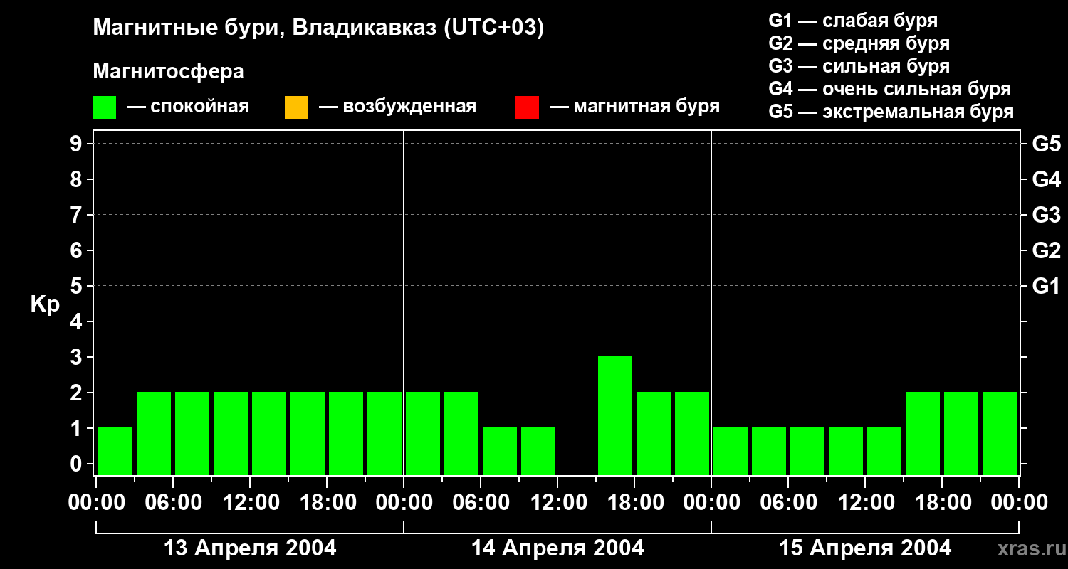 Изменения геомагнитного индекса Kp с 13 по 15 апреля 2004 года для средних широт