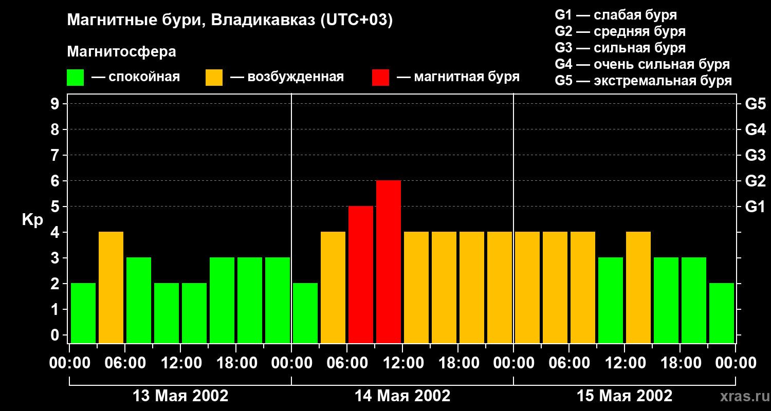 Изменения геомагнитного индекса Kp с 13 по 15 мая 2002 года для средних широт