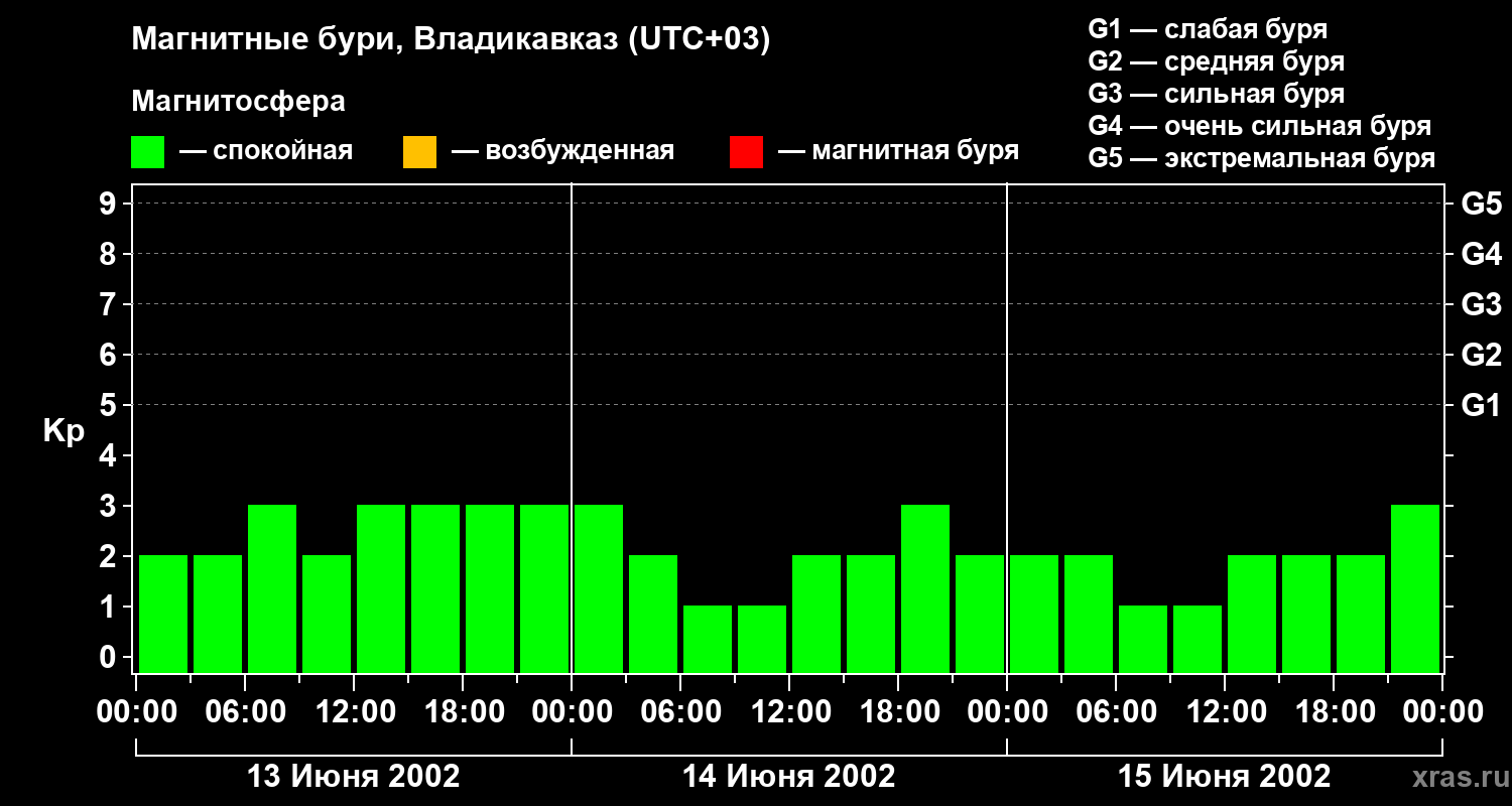 Изменения геомагнитного индекса Kp с 13 по 15 июня 2002 года для средних широт