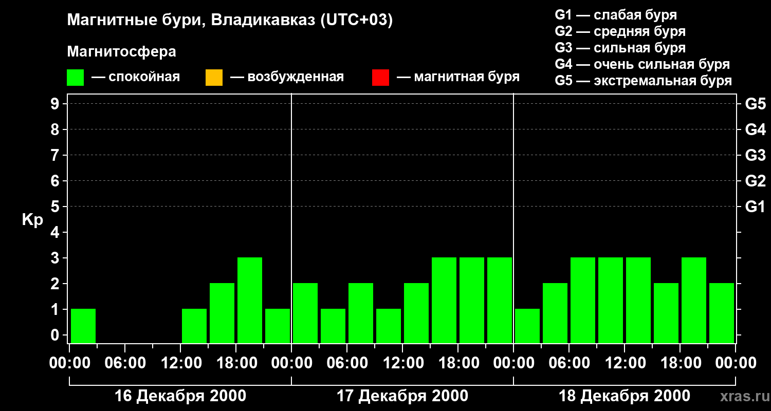 Изменения геомагнитного индекса Kp с 16 по 18 декабря 2000 года для средних широт
