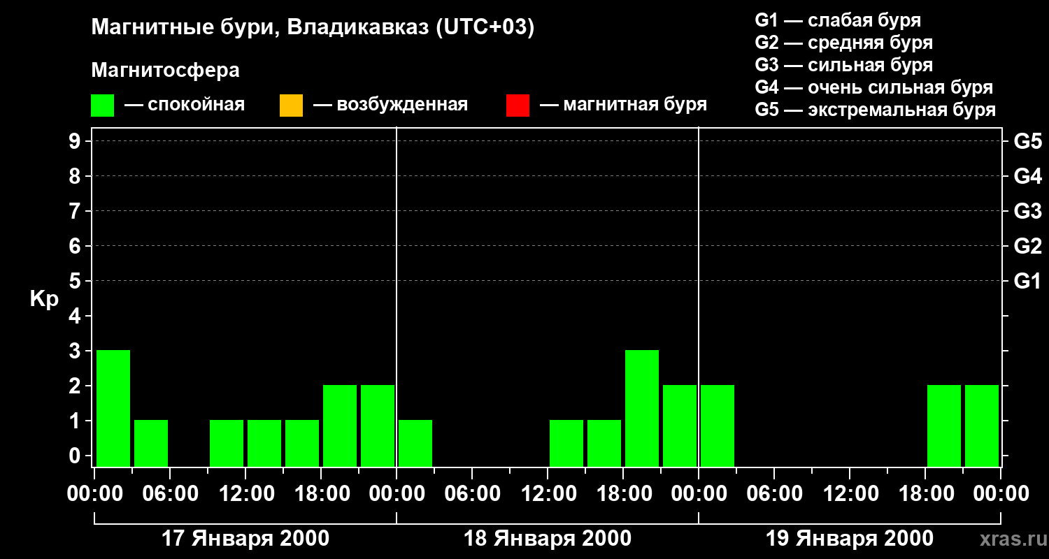 Изменения геомагнитного индекса Kp с 17 по 19 января 2000 года для средних широт