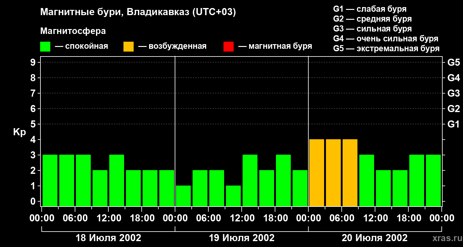 Изменения геомагнитного индекса Kp с 18 по 20 июля 2002 года для средних широт
