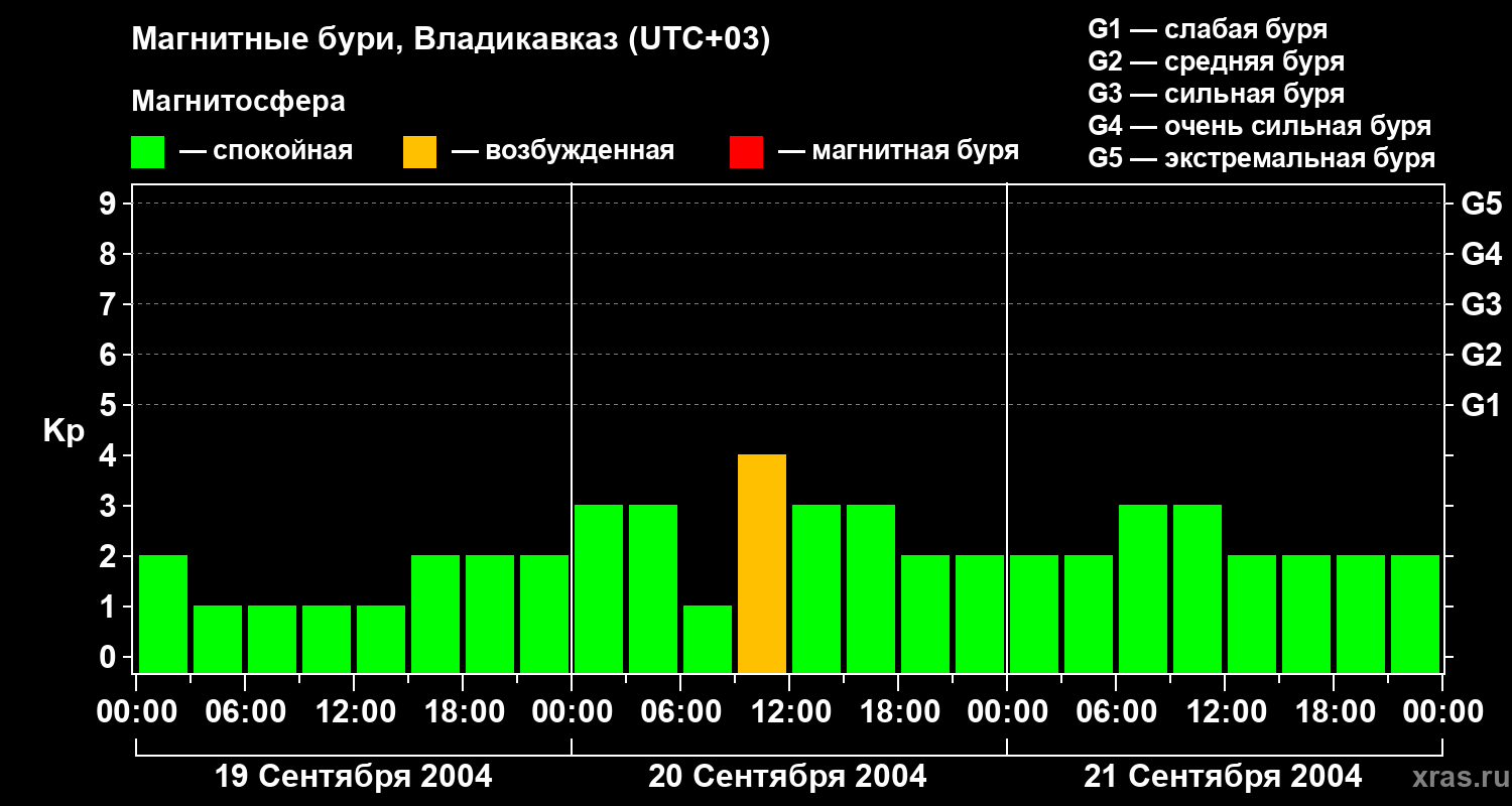 Изменения геомагнитного индекса Kp с 19 по 21 сентября 2004 года для средних широт