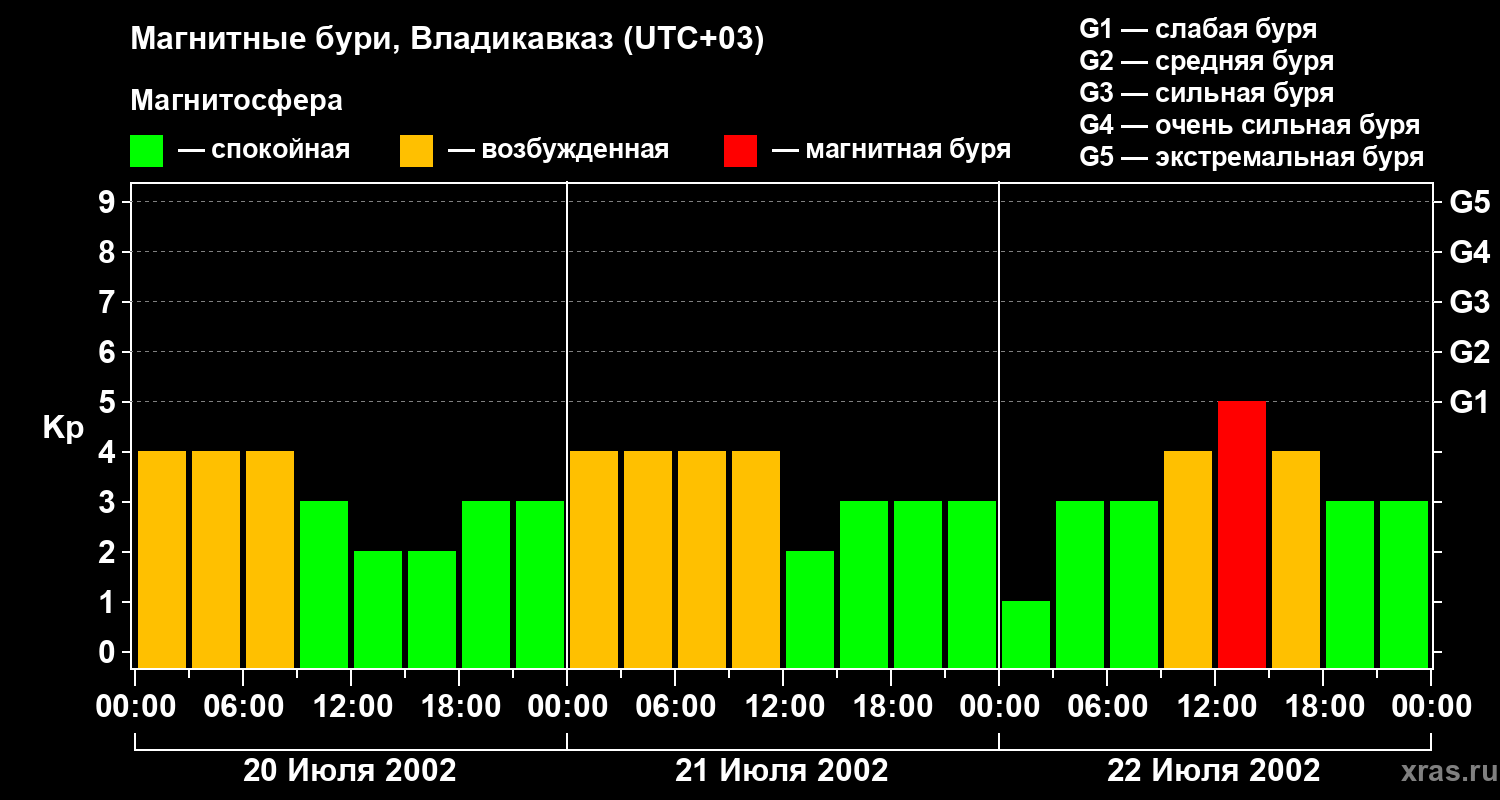 Изменения геомагнитного индекса Kp с 20 по 22 июля 2002 года для средних широт