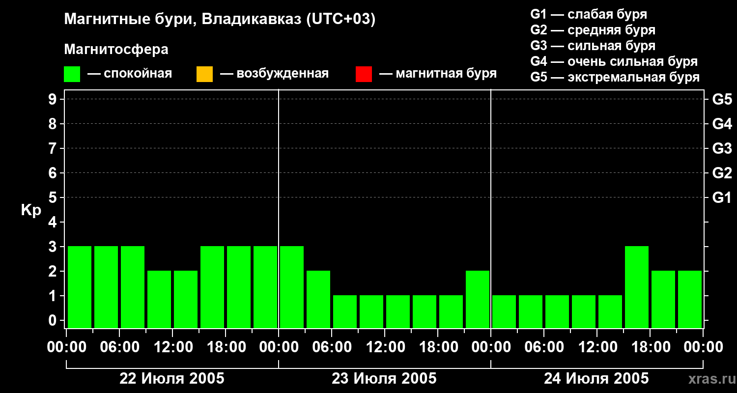 Изменения геомагнитного индекса Kp с 22 по 24 июля 2005 года для средних широт