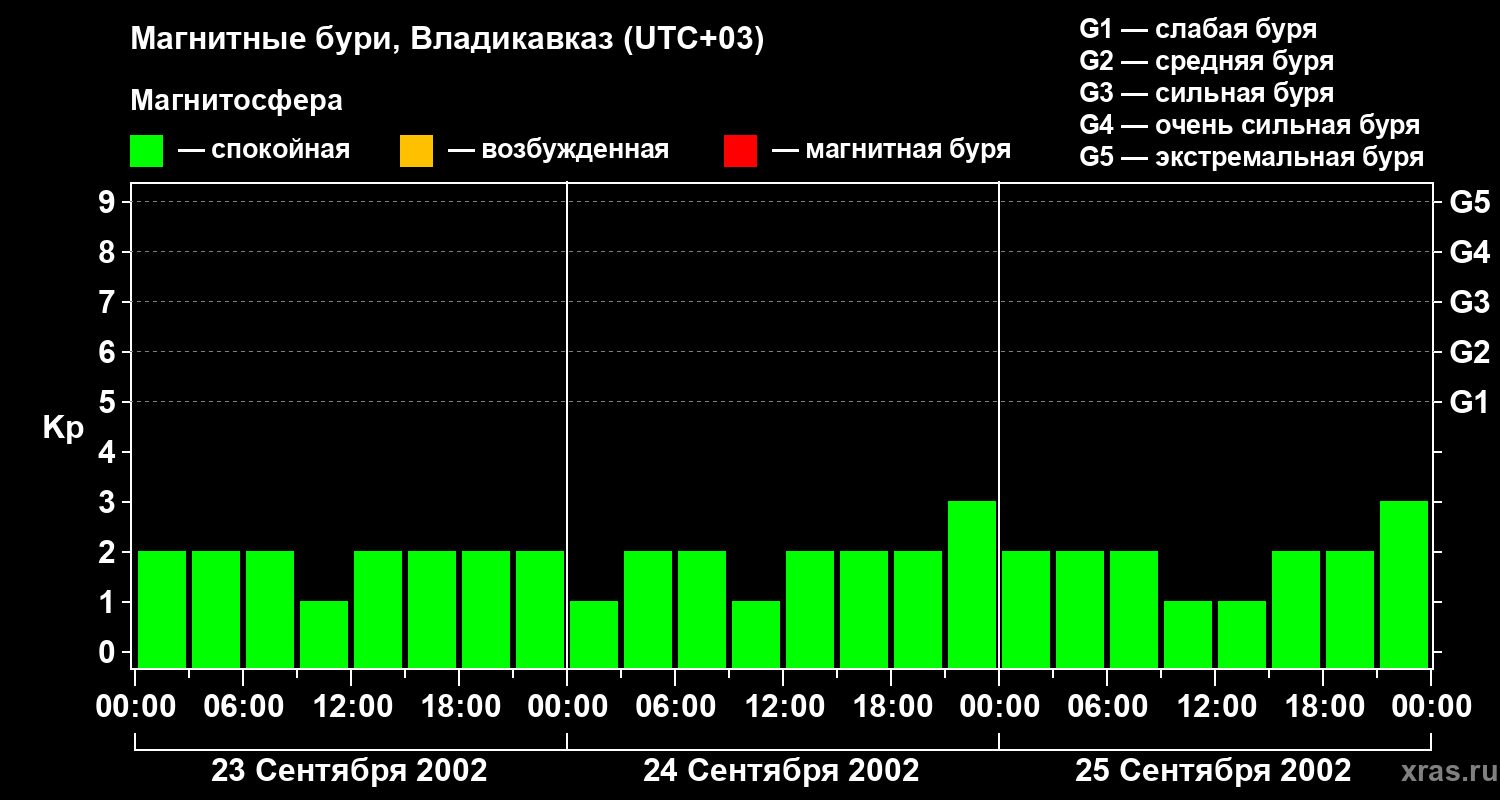 Изменения геомагнитного индекса Kp с 23 по 25 сентября 2002 года для средних широт