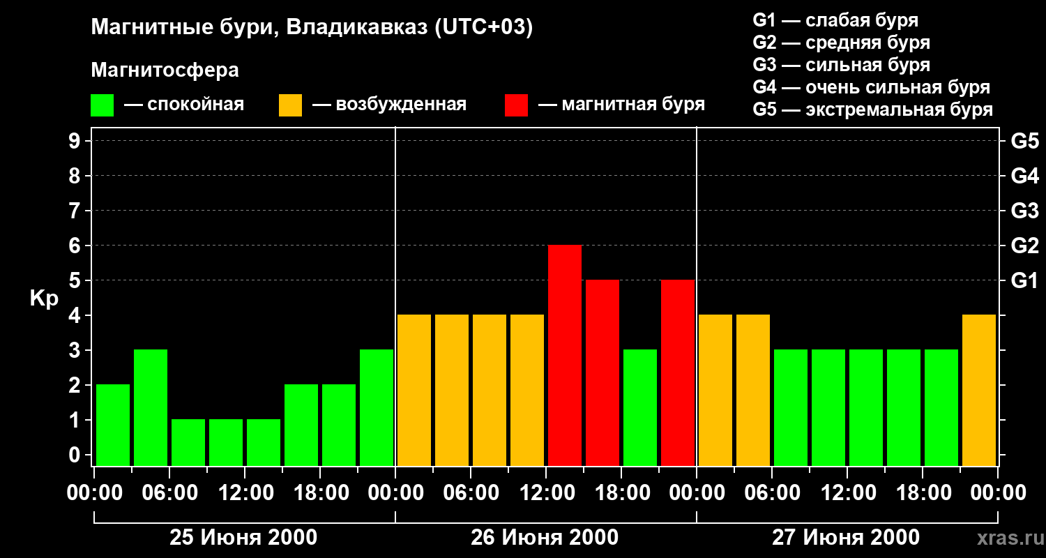 Изменения геомагнитного индекса Kp с 25 по 27 июня 2000 года для средних широт