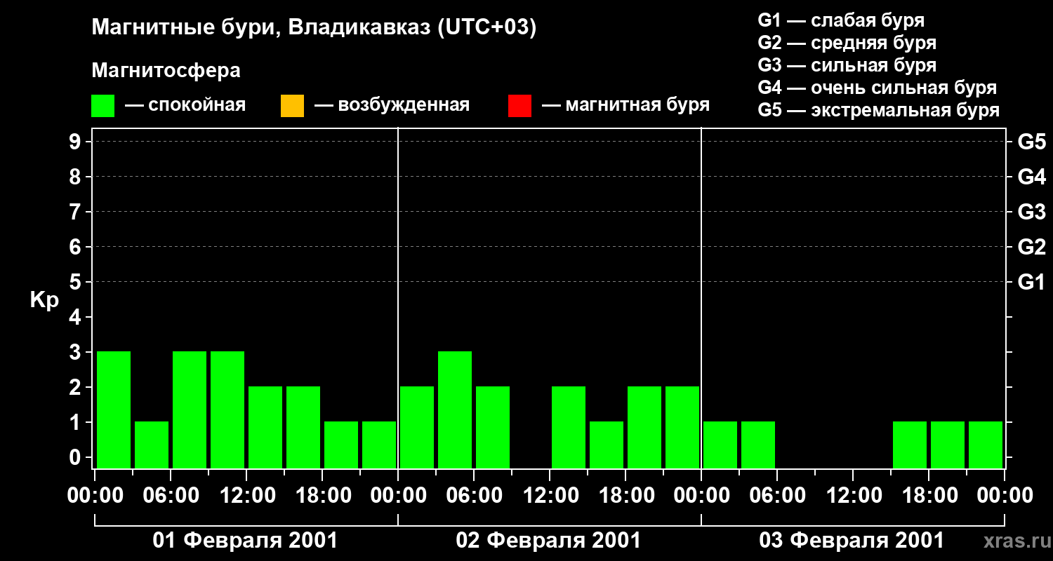 Изменения геомагнитного индекса Kp с 1 по 3 февраля 2001 года для средних широт