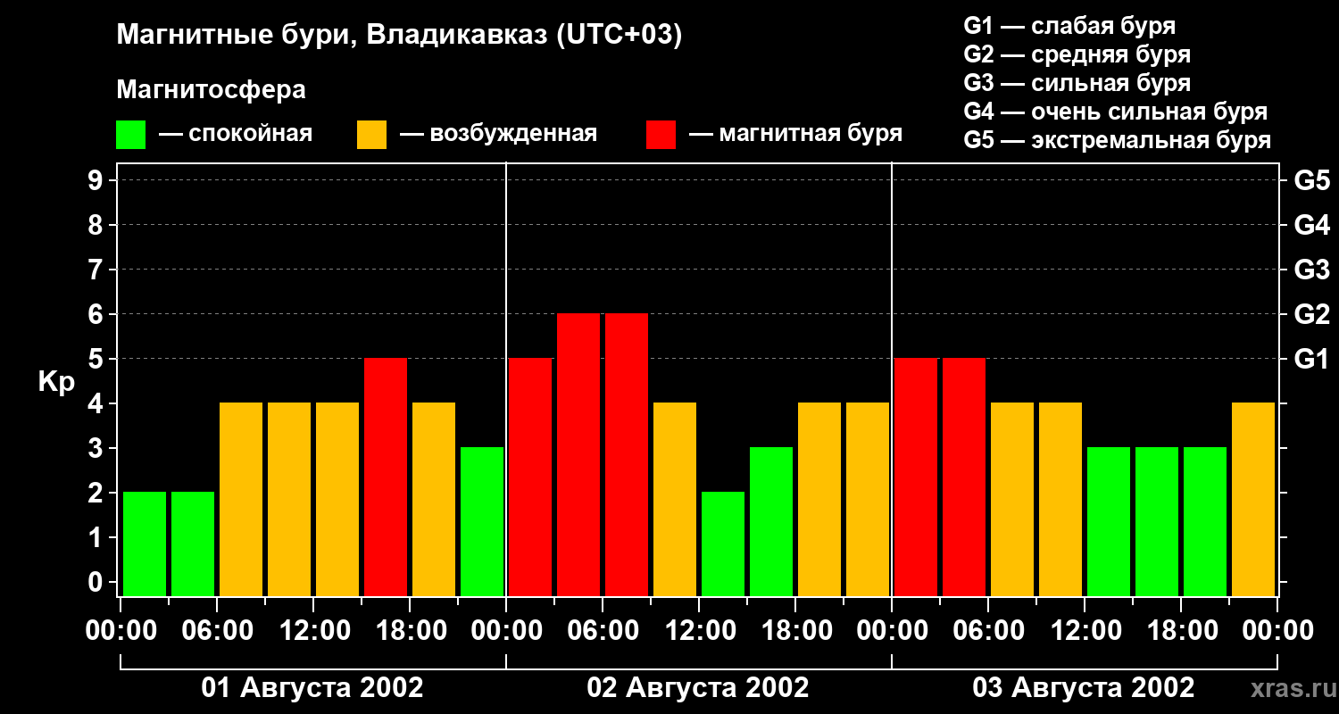 Изменения геомагнитного индекса Kp с 1 по 3 августа 2002 года для средних широт