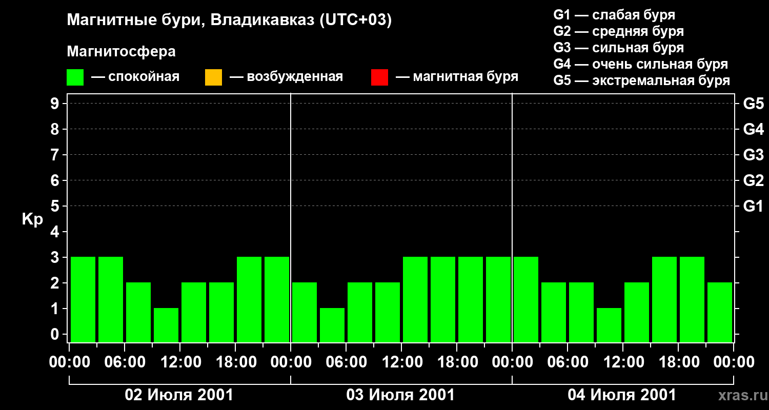 Изменения геомагнитного индекса Kp с 2 по 4 июля 2001 года для средних широт