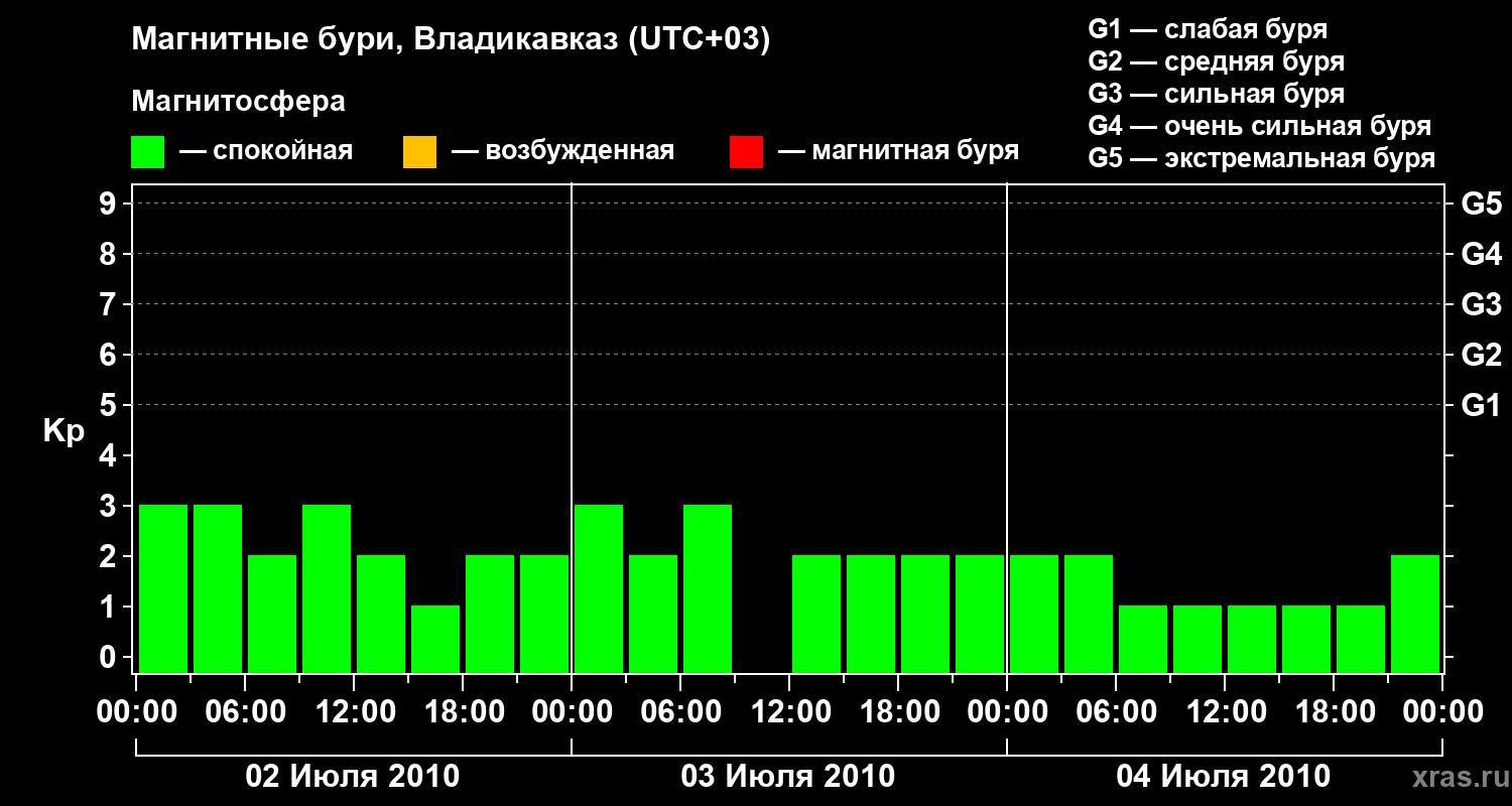 Изменения геомагнитного индекса Kp с 2 по 4 июля 2010 года для средних широт