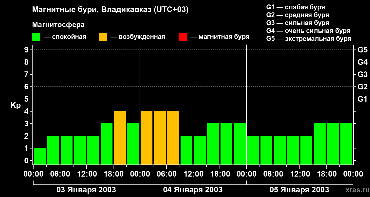 Изменения геомагнитного индекса Kp с 3 по 5 января 2003 года для средних широт