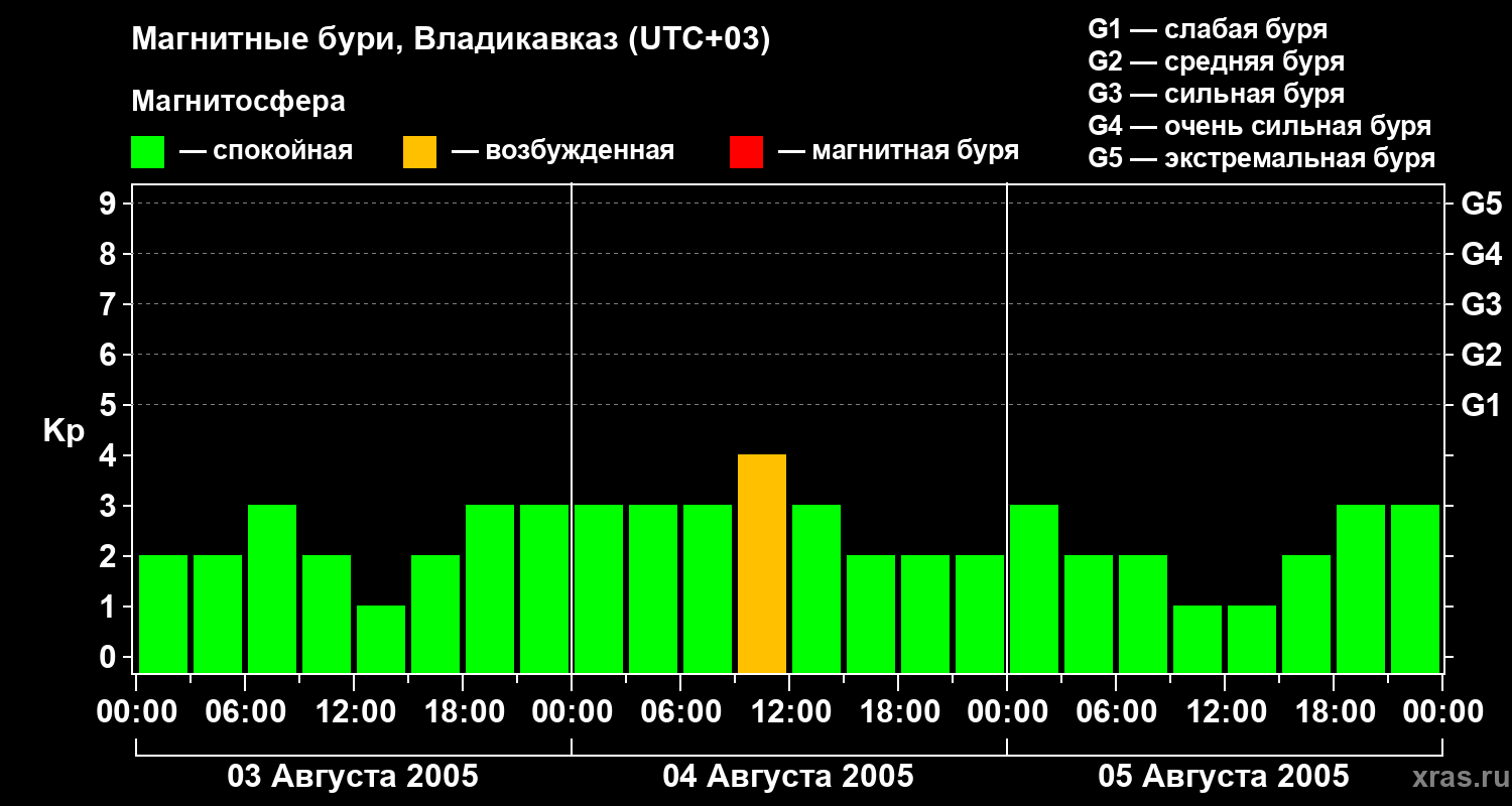 Изменения геомагнитного индекса Kp с 3 по 5 августа 2005 года для средних широт