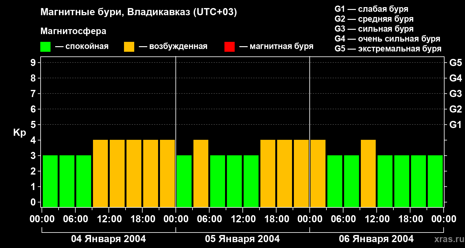 Изменения геомагнитного индекса Kp с 4 по 6 января 2004 года для средних широт