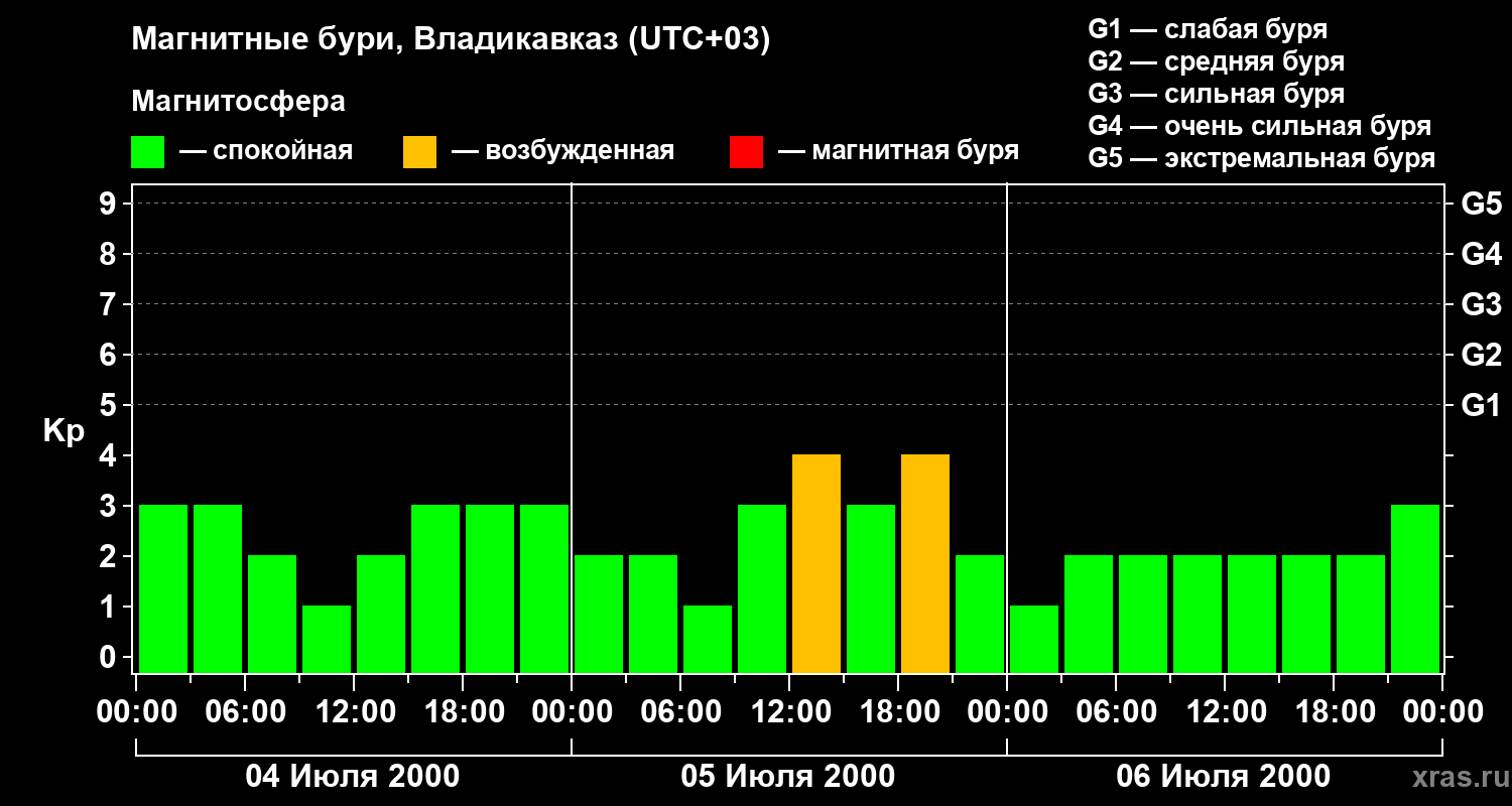 Изменения геомагнитного индекса Kp с 4 по 6 июля 2000 года для средних широт