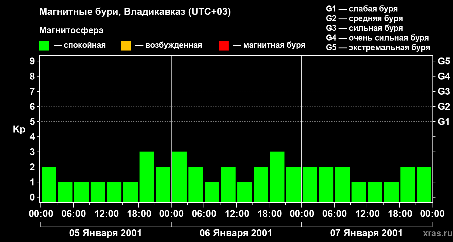 Изменения геомагнитного индекса Kp с 5 по 7 января 2001 года для средних широт